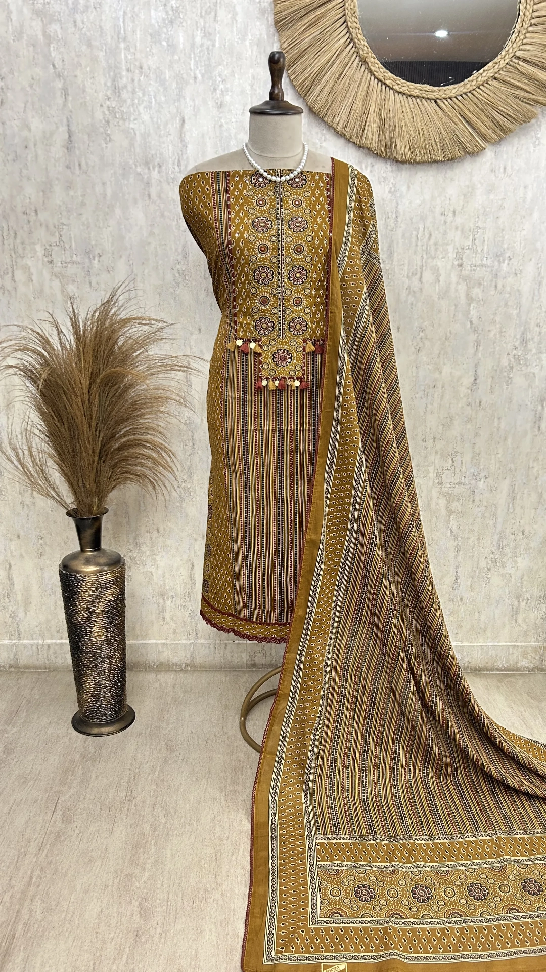 Master the art of traditional block-printing with this exquisite unstitch suit, featuring authentic Ajrakh patterns rooted in centuries of Indian textile heritage. Each piece showcases hand-crafted motifs in rich, earthy tones that reflect the meticulous dyeing and printing techniques of master artisans. The premium fabric drapes elegantly, offering versatility for both casual wear and festive occasions. Perfect for those who appreciate slow fashion and timeless craftsmanship, this suit allows you to customize the fit while celebrating sustainable, heritage-inspired design.