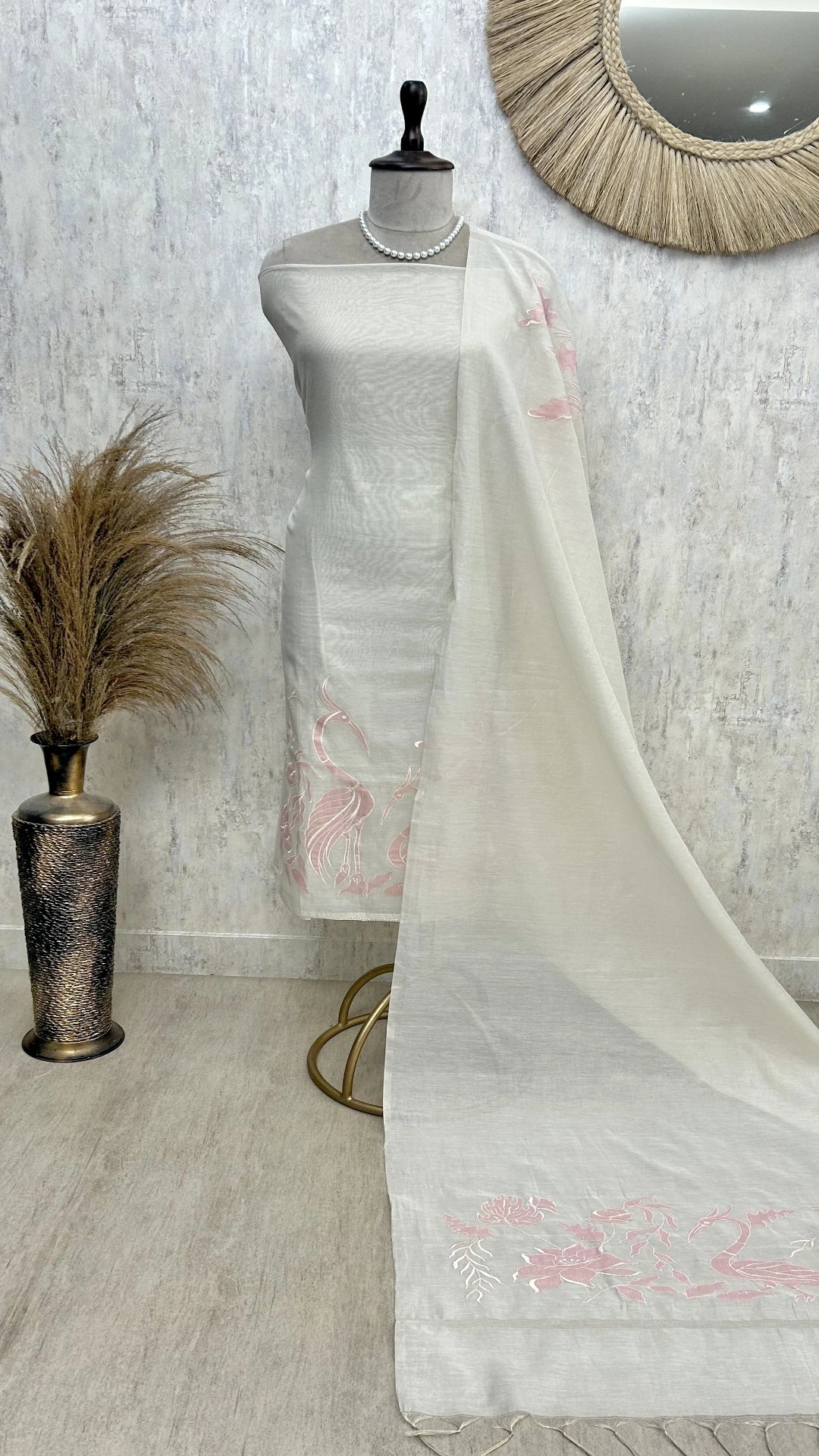 Turn heads with this stunning linen tissue unstitched suit set, featuring delicate appliqué work with charming flamingo motifs. The sheer elegance of linen tissue fabric, paired with playful yet sophisticated flamingo designs, creates a look that is both whimsical and graceful. Whether styled for daytime gatherings or special occasions, this ensemble adds a unique artistic touch to your ethnic wardrobe.