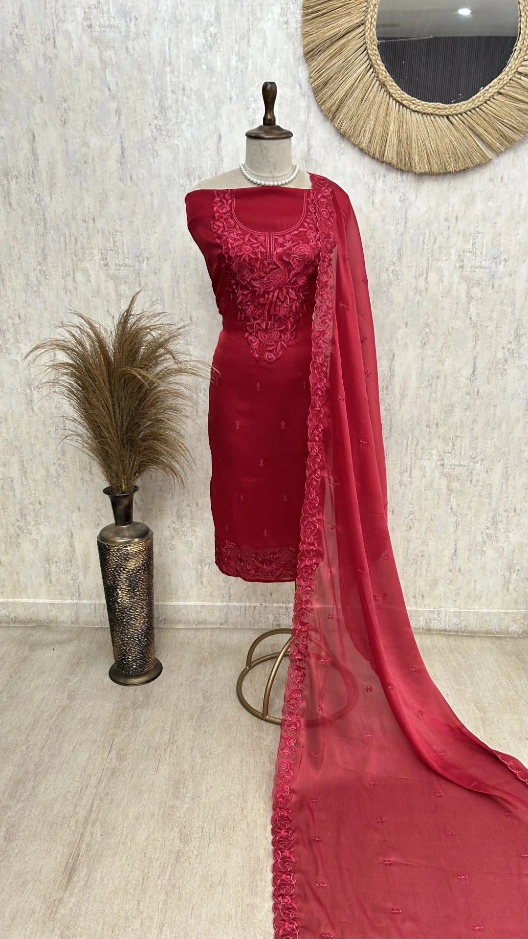 Elevate your wardrobe with this exquisite bird motif organza unstitched suit set. Crafted from premium organza fabric, this ensemble features intricate bird embroidery that adds sophistication and artistic flair to your collection. The unstitched format allows complete customization—choose your preferred fit, length, and tailoring style to create a piece that's uniquely yours. Perfect for festive occasions, celebrations, or everyday elegance, this suit set combines traditional craftsmanship with contemporary design sensibilities. The delicate organza drape ensures comfort while maintaining a refined silhouette, making it an ideal choice for those who appreciate quality fabrics and detailed embellishment work.