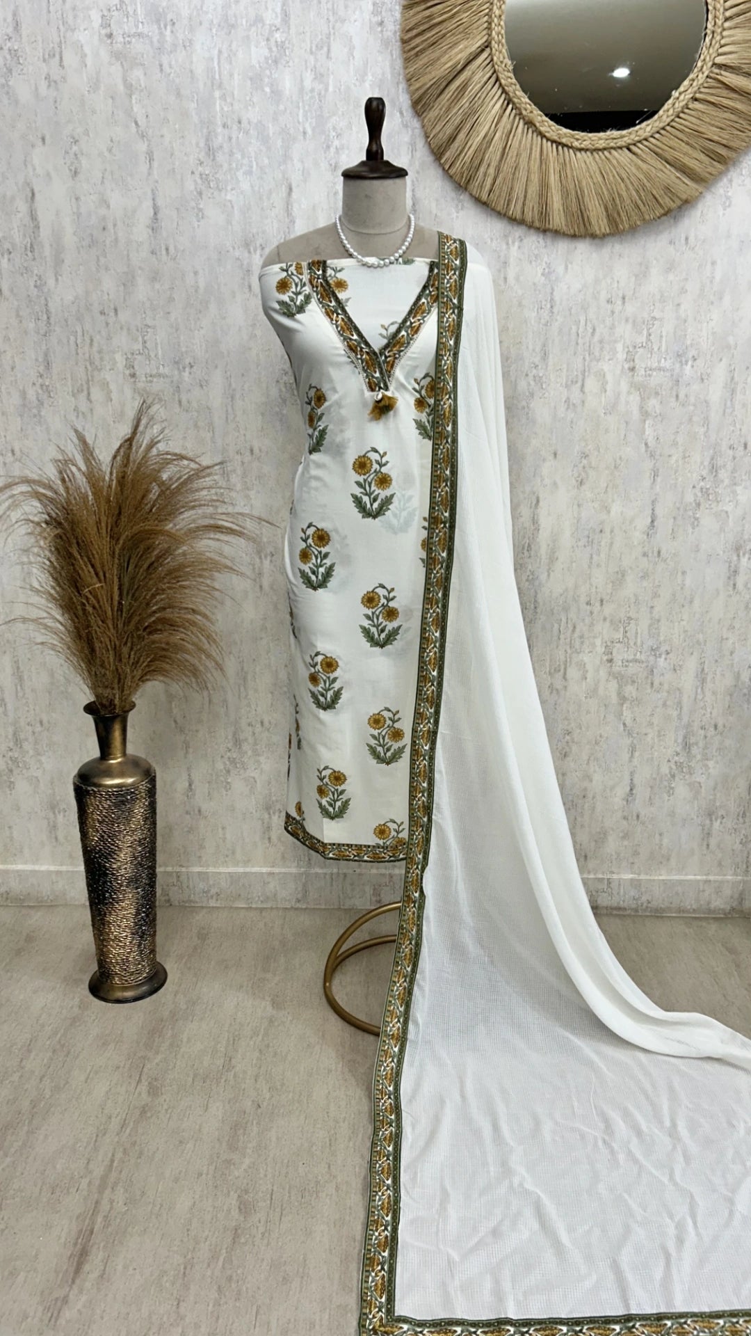 This cotton unstitched suit set features beautifully hand-block printed patterns that reflect timeless craftsmanship. The soft, breathable fabric ensures all-day comfort, making it ideal for casual outings or summer gatherings. The set includes a coordinated top, bottom, and dupatta, all adorned with subtle prints that strike the perfect balance between elegance and tradition.