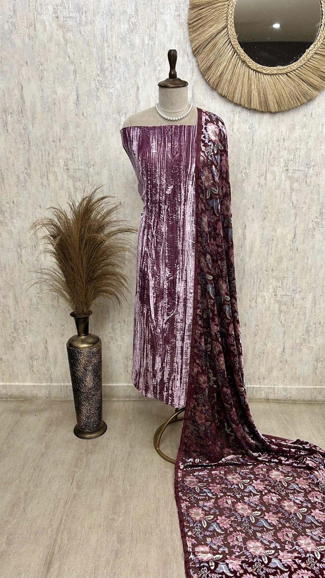 The Brasso Velvet Unstitched Suit Set offers a refined blend of rich velvet fabric with delicate brasso embroidery, allowing you to tailor a custom outfit that perfectly fits your style and occasion. This unstitched set provides the flexibility to create a sophisticated ensemble, combining comfort and elegance with the timeless appeal of luxurious textures. Ideal for formal events, it delivers a premium foundation for personalized tailoring.