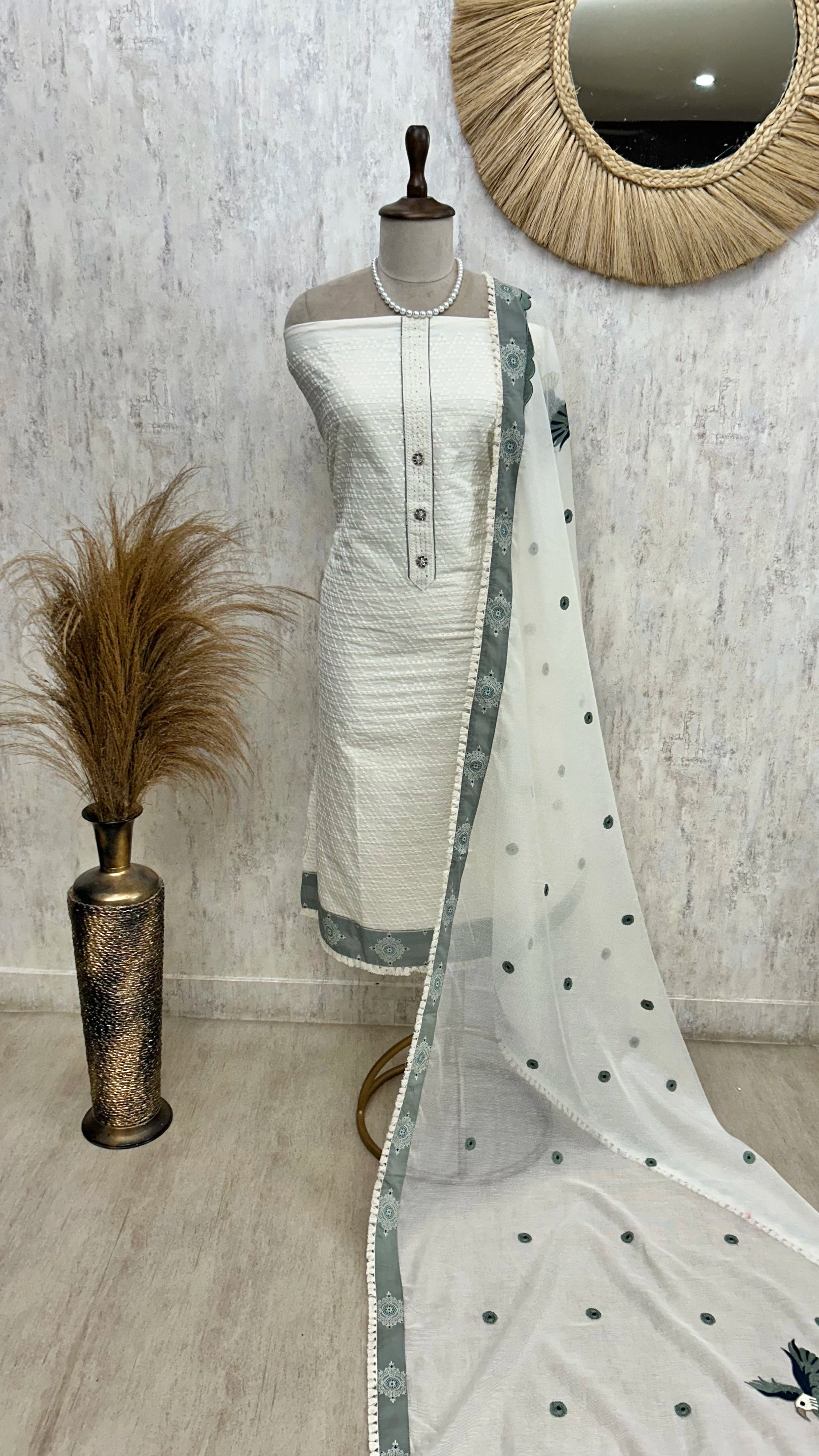 Experience the comfort and versatility of this cotton unstitched suit set paired with a matching cotton dupatta. Crafted from breathable cotton fabric, it offers a natural softness ideal for customizing your perfect fit. The included dupatta complements the set, providing a cohesive and elegant ensemble ready to be tailored to your style and occasion. Perfect for warm climates, this suit set combines traditional charm with practical ease.