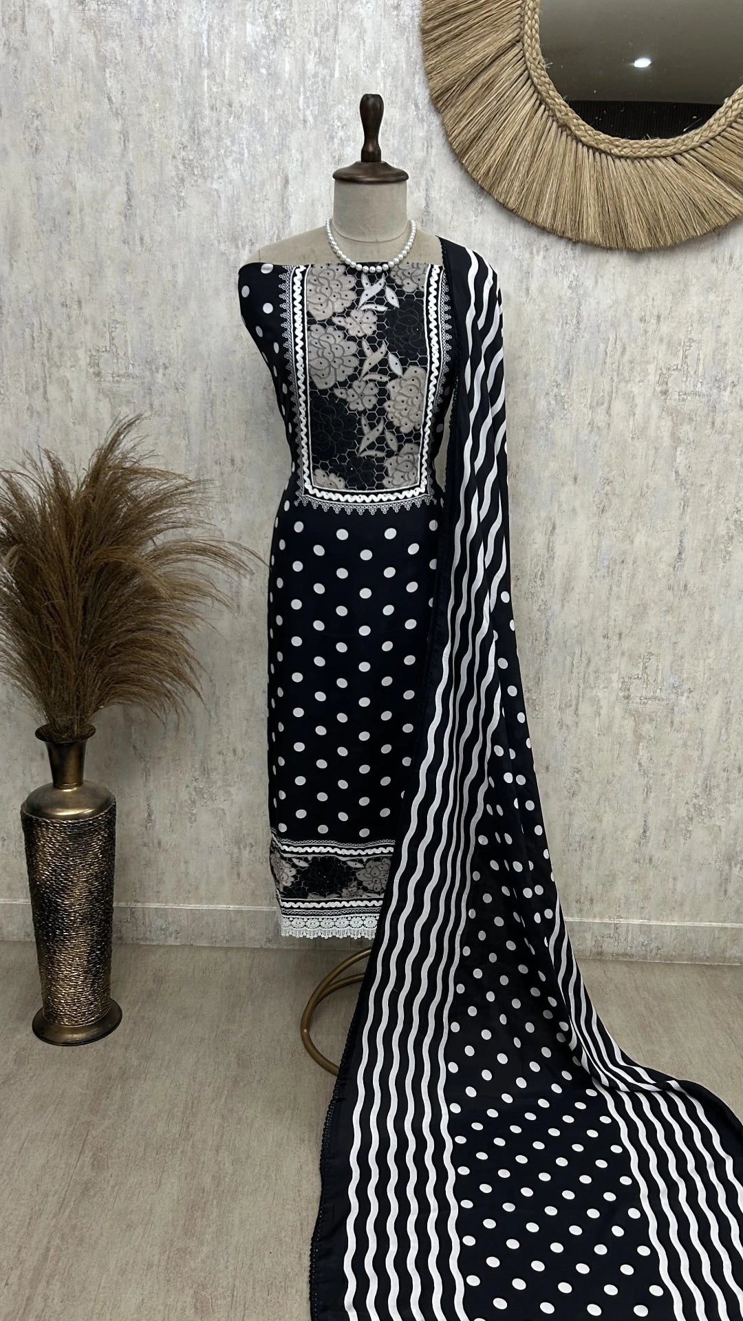 Add a fresh burst of elegance to your wardrobe with our Muslin Unstitched Suit Set featuring a charming blend of floral and polka dot prints. Light, breathable, and irresistibly soft, this set is ideal for daytime outings, casual gatherings, or workwear with a stylish twist. Also, the base of shirt has two options black and white and their print is