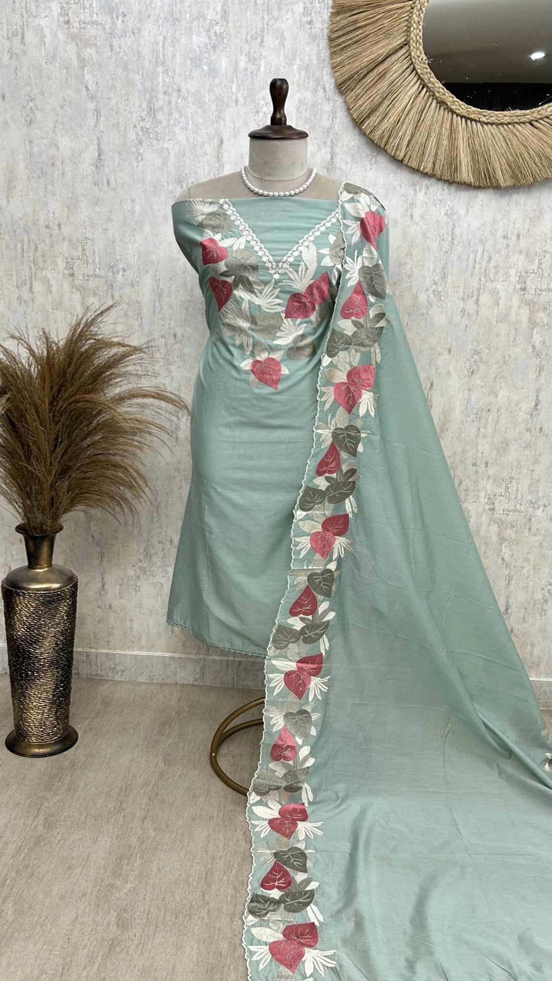A blend of tradition and elegance, this Paan Motifs Mul Chanderi Unstitched Suit Set celebrates timeless Indian artistry. The kurta is crafted from soft, lightweight mul chanderi, adorned with intricately embroidered paan (betel leaf) motifs, symbolizing prosperity and grace in Indian culture.