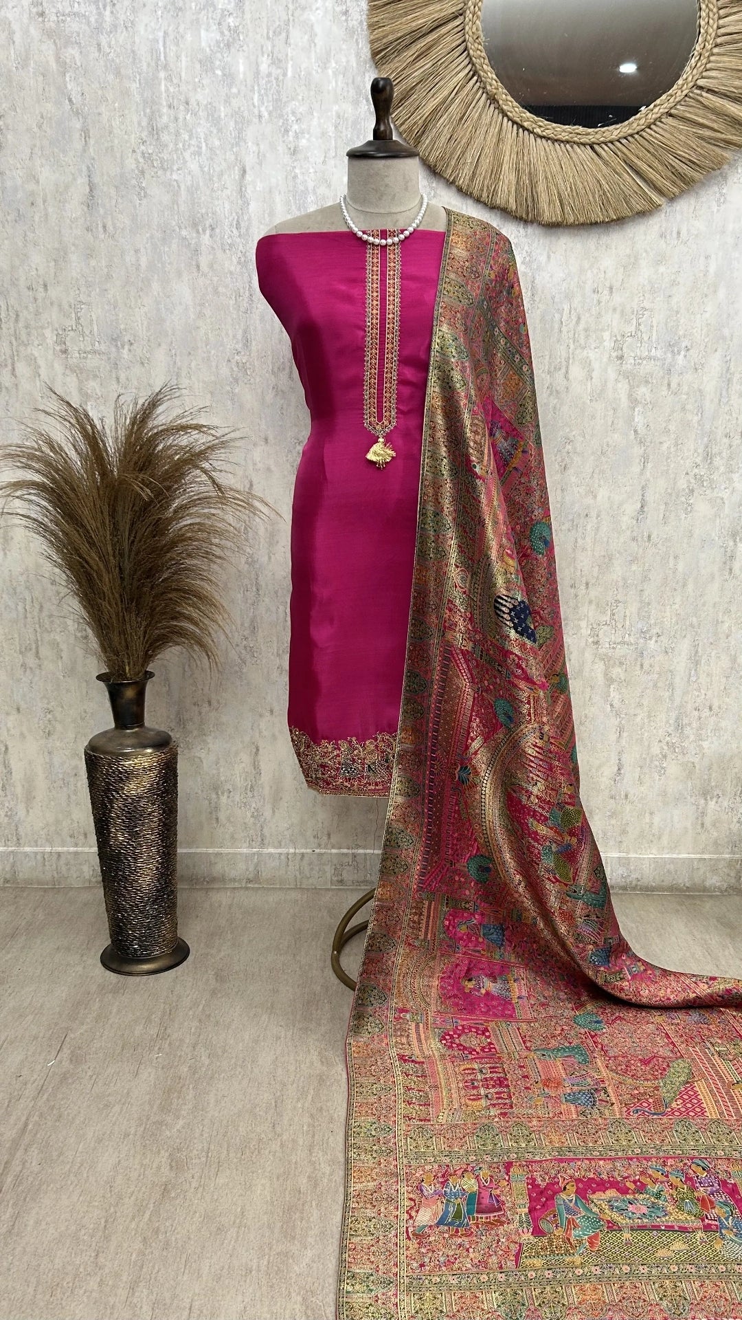 Elevate your wardrobe with this premium Royale Silk unstitched fabric, featuring an exquisite position print design. Crafted from luxurious silk, this fabric offers a natural sheen and smooth texture ideal for creating sophisticated garments. The carefully placed print pattern adds visual interest while maintaining elegance. Perfect for tailoring custom suits, sarees, or formal wear, this unstitched fabric gives you complete creative control over your final design. The high-quality silk ensures durability and a refined drape that enhances any silhouette. An excellent choice for discerning customers seeking premium fabrics with distinctive styling.