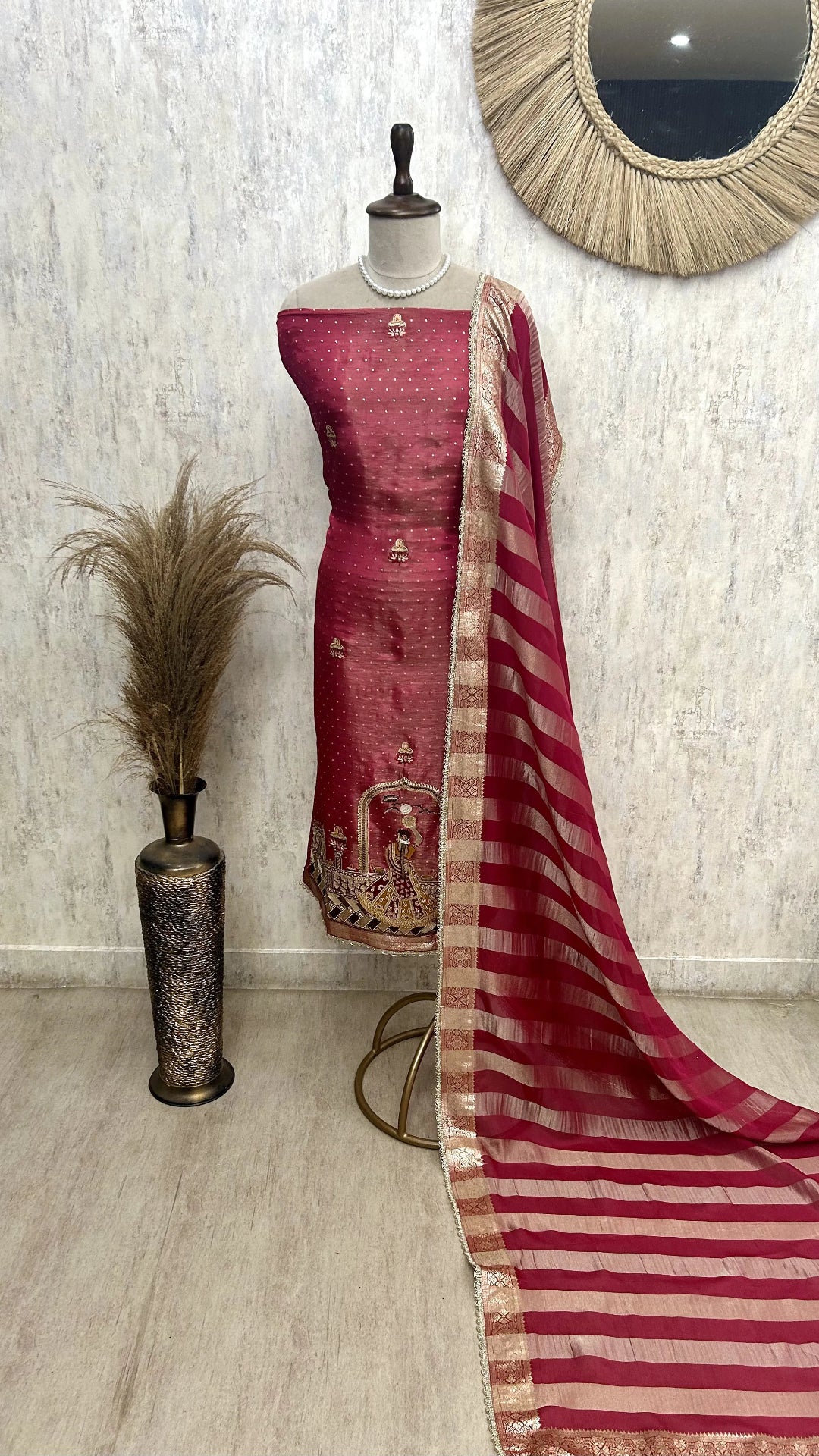 Elevate your wardrobe with this Tissue Unstitched Suit Set paired with a delicate Organza Dupatta. Crafted from lightweight tissue fabric, the suit offers a smooth, breathable base perfect for customization. The sheer organza dupatta adds a refined, elegant touch, enhancing your ensemble with subtle sophistication. Ideal for both casual and formal occasions, this unstitched set gives you the freedom to tailor it to your preferred style and fit.